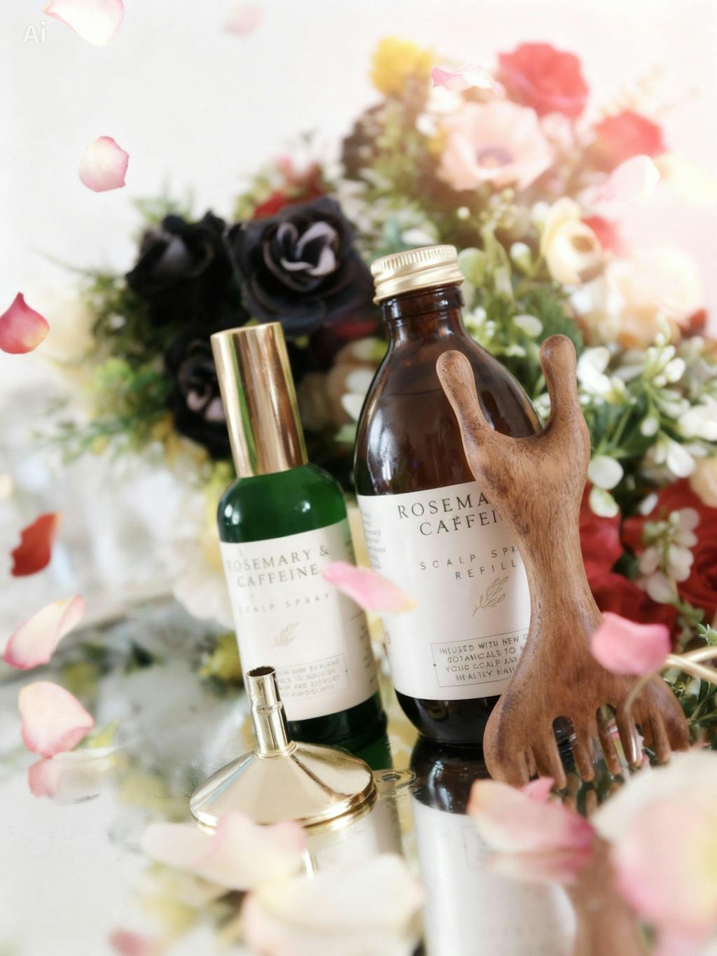 Begin with the 100ml botanical scalp spray — a nutrient-rich blend of six natural extracts designed to refresh and nourish the scalp. Easily top up with the 300ml refill using the reusable stainless-steel funnel. Complete your routine with the wooden scalp massager, crafted to help promote relaxation, encourage circulation, and support absorption of your botanical spray.